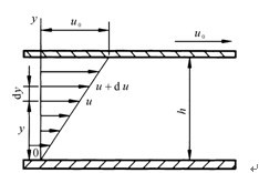 当液体活动时,因为液体与固体壁面的附出力及流体自身的粘性使流体内遍地的速率巨细不等,以流体沿如图2-2所示的平行平板间的活动环境为例,设上平板以速率u0向右活动,下平板牢固不动。紧贴于上平板上的流体粘附于上平板上,其速率与上平板不异。紧贴于下平板上的流体粘附于下平板图2-2液体的粘性表现图上,其速率为零。中间流体的速率按线性散布。咱们把这类活动当作是很多无穷薄的流体层在活动,当活动较快的流体层在活动较慢的流体层上滑过期,两层间因为粘性就发生内磨擦力的感化。按照现实测定的数据所知,流体层间的内磨擦力F与流体层的打仗面积A及流体层的相对流速du成正比,而与此二流体层间的间隔dz成正比,即:F=μAdu/dz